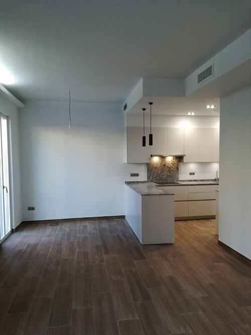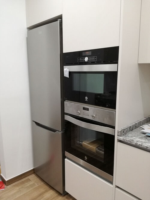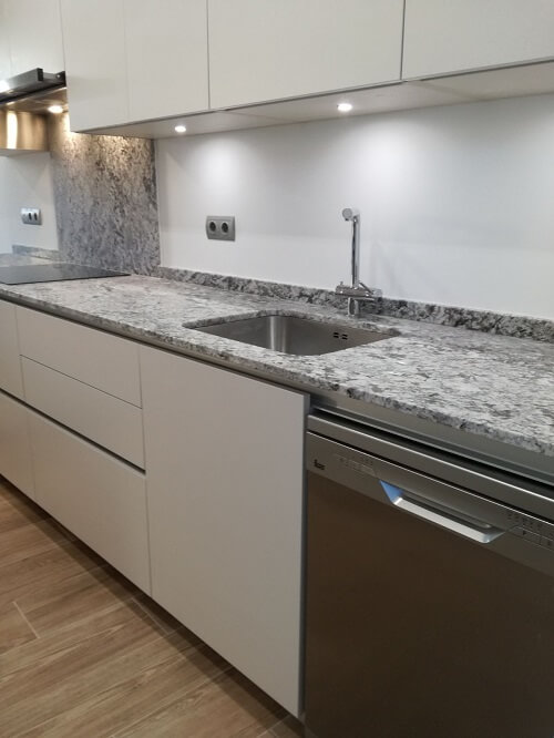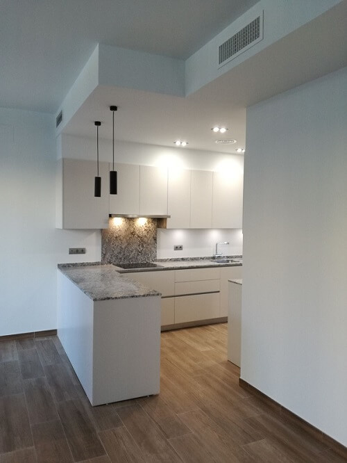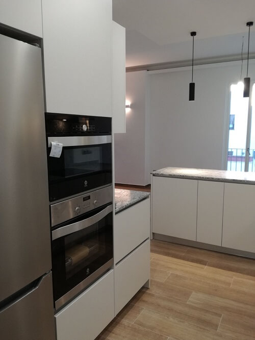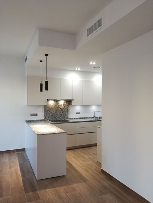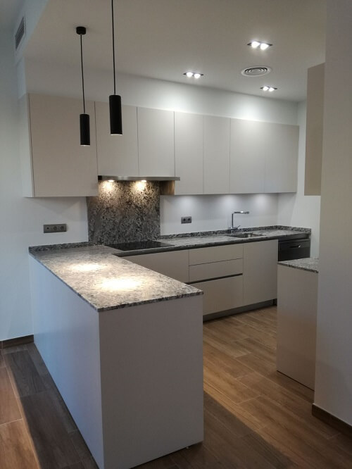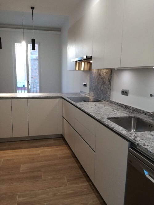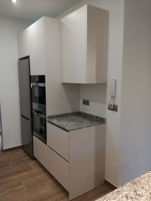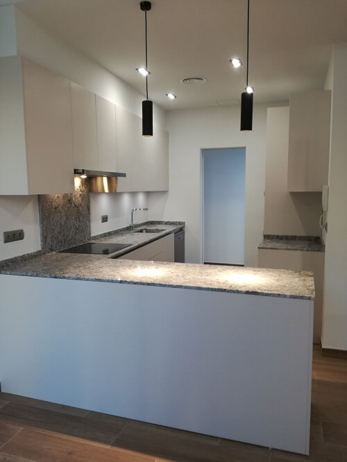 Cuina amb mobiliari de la marca Inko sèrie Gourmet en color fumet mat. Els tiradors són de gola en alumini. El sòcol d’alumini. Hi ha llums Leds encastats sota els mobles alts. El granit és de Naturamia color Lennon vintage de 2 cm de gruix. S’ha creat una península per separar-la de la sala-menjador. Darrere del taulell de cuina per a major protecció s’ha col·locat un aplacat. Els mobles alts són de 90 cm d’altura. La campana integrada al moble.