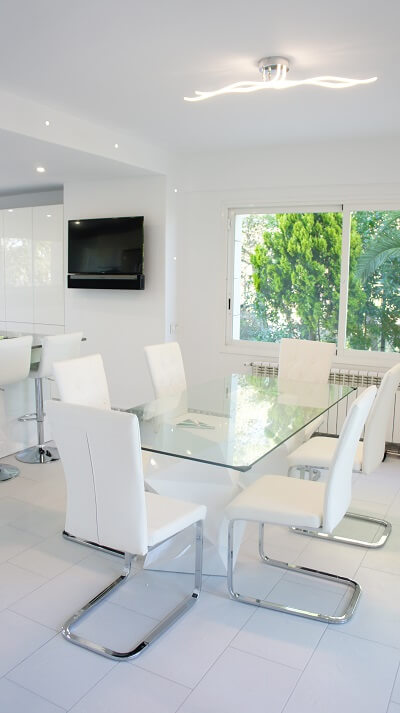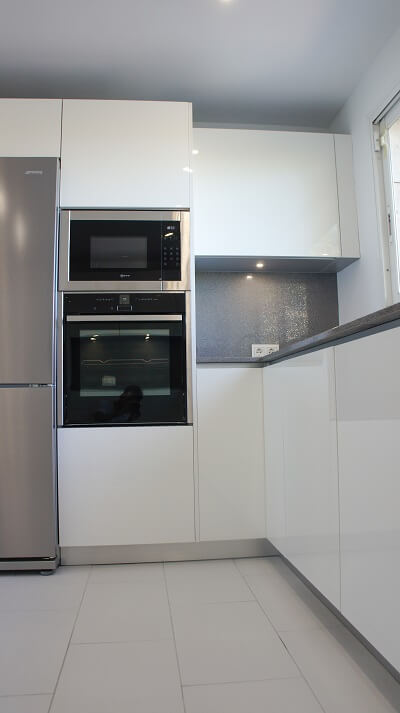 La nevera és americana i és de la marca Smeg. El mobiliari de cuina és de la marca Inko de color blanc brillant, sense tiradors. Molt funcional, no li falta detall tant en calaixos i gaveteros extraïbles, columnes de rebost, calaixos interiors, especiers a més de llums leds encastats en mobles alts per aconseguir punts de llum de baix consum i de color càlid en el pla de treball.
