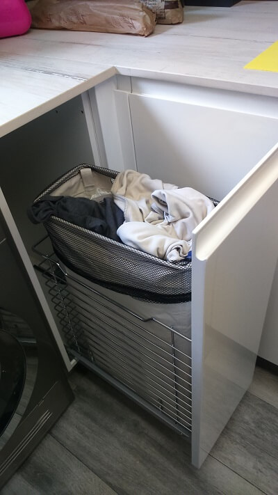 El mobiliari de cuina és de la marca Inko model Amàlia en color blanc brillant. L’estètica és sense tiradors ja que la pròpia porta ja té la forma. El taulell és Dekton color Makai. S’ha enderrocat una paret de l’safareig per unificar l’espai i fer més gran la cuina. La rentadora s’ha incorporat a la cuina i, per a més comoditat, s’ha instal·lat un moble base amb cistell extraïble per recollir la roba bruta. També s’ha creat una petita zona de cafè reduint el taulell de fons per no entorpir el pas. L’espai és còmode, funcional i alhora bonic. Una cuina ben aprofitada.