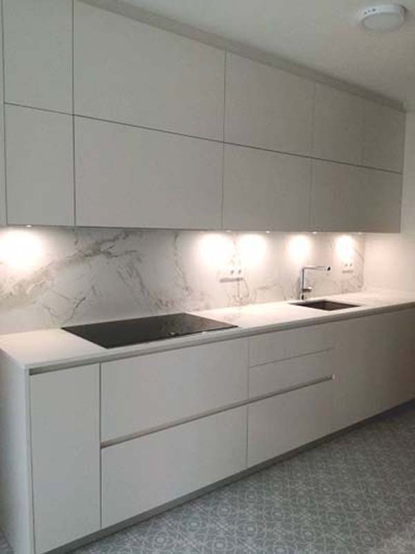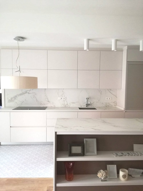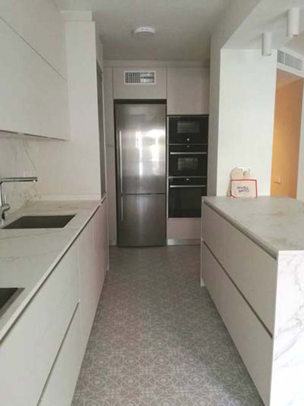 El taulell és de color clar tipus amarmolado que ajuda a donar més lluminositat si cap a el conjunt. El model és ENTZO de la col·lecció DEKTON de Cosentino. La columna forn i microones i la nevera queden darrere de l’pilar. El sòl de dibuix hidràulic en tons grisos i suaus rematen el tot.