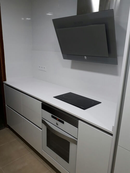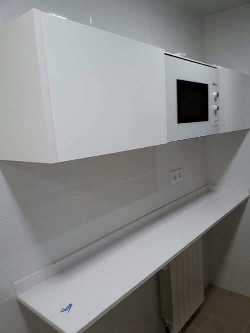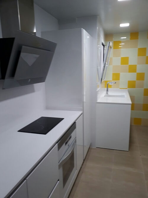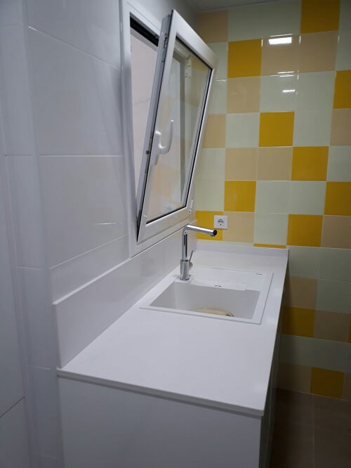 S’ha canviat la finestra en alumini blanc i realitzat treballs de paleta i lampisteria. El taulell és de Silestone Blanc Zeus en 2 cm cantell recte.