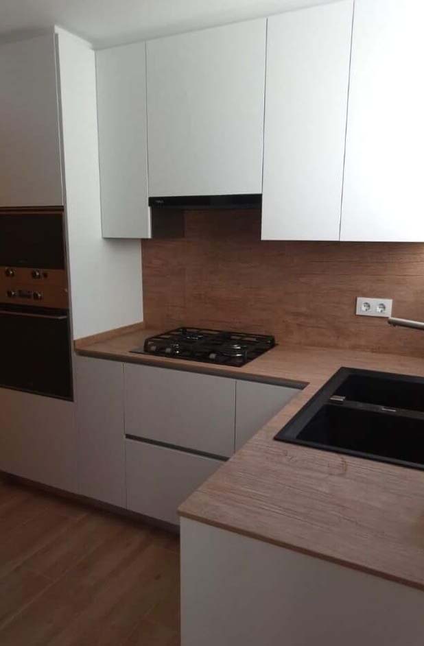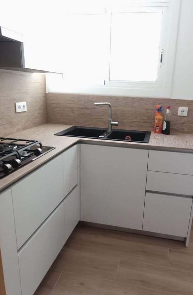 La propietat, Sonia, va triar una porta d’acabat mat blanc sense tirador per donar més sensació de lleugeresa i modernitat. El mobiliari és de la marca INKO acabat Gourmet Chantilly i el taulell és el model Bohème de la marca Neolith , un porcelànic de llauna resistència a la calor i al ratllat.