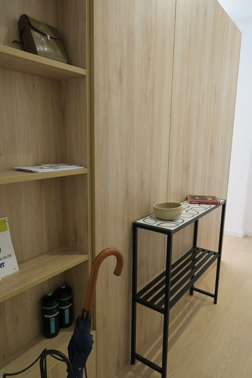 En aquesta reforma de la cuina, els clients necessitaven crear un espai en el qual estiguessin compartits el rebedor de el pis i amb la cuina per falta d’espai. Per aconseguir-ho es va idear una solució molt pràctica en la qual els armaris per a la nevera integrada, el rebost i la columna per a la integració de l’forn i microones servissin de paret divisòria entre el rebedor i la cuina. Així en la part del darrere de totes aquestes columnes es va deixar un buit per prestatgeries i armari d’utilitat per al rebedor. Tot està fet el mateix material i color de la cuina.