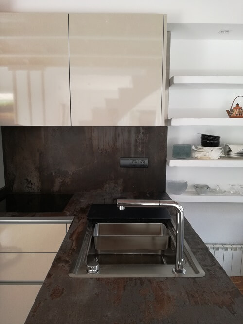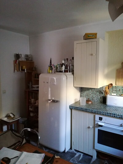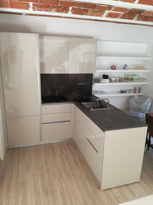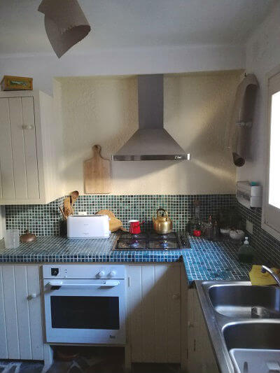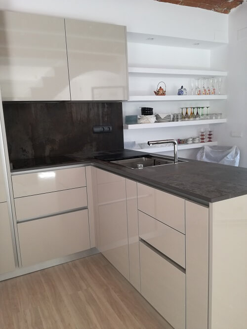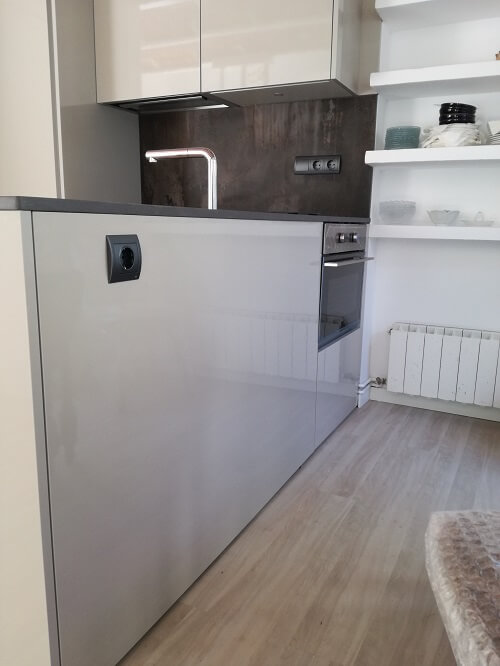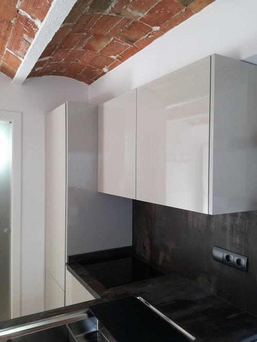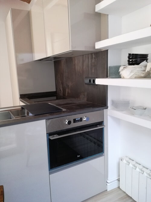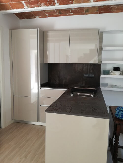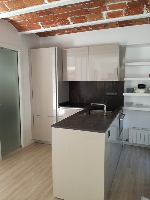 En aquesta cuina s’han fet molts canvis. Per a la cuina a més de canviar la seva ubicació, s’ha optat per fer una distribució en forma de península per aprofitar millor l’espai. El resultat és una mini kitchen super resultona, funcional i molt acollidora. El forn és compacte i està ubicat en una base de la península amb cistell extraïble sota per optimitzar l’espai d’emmagatzematge.