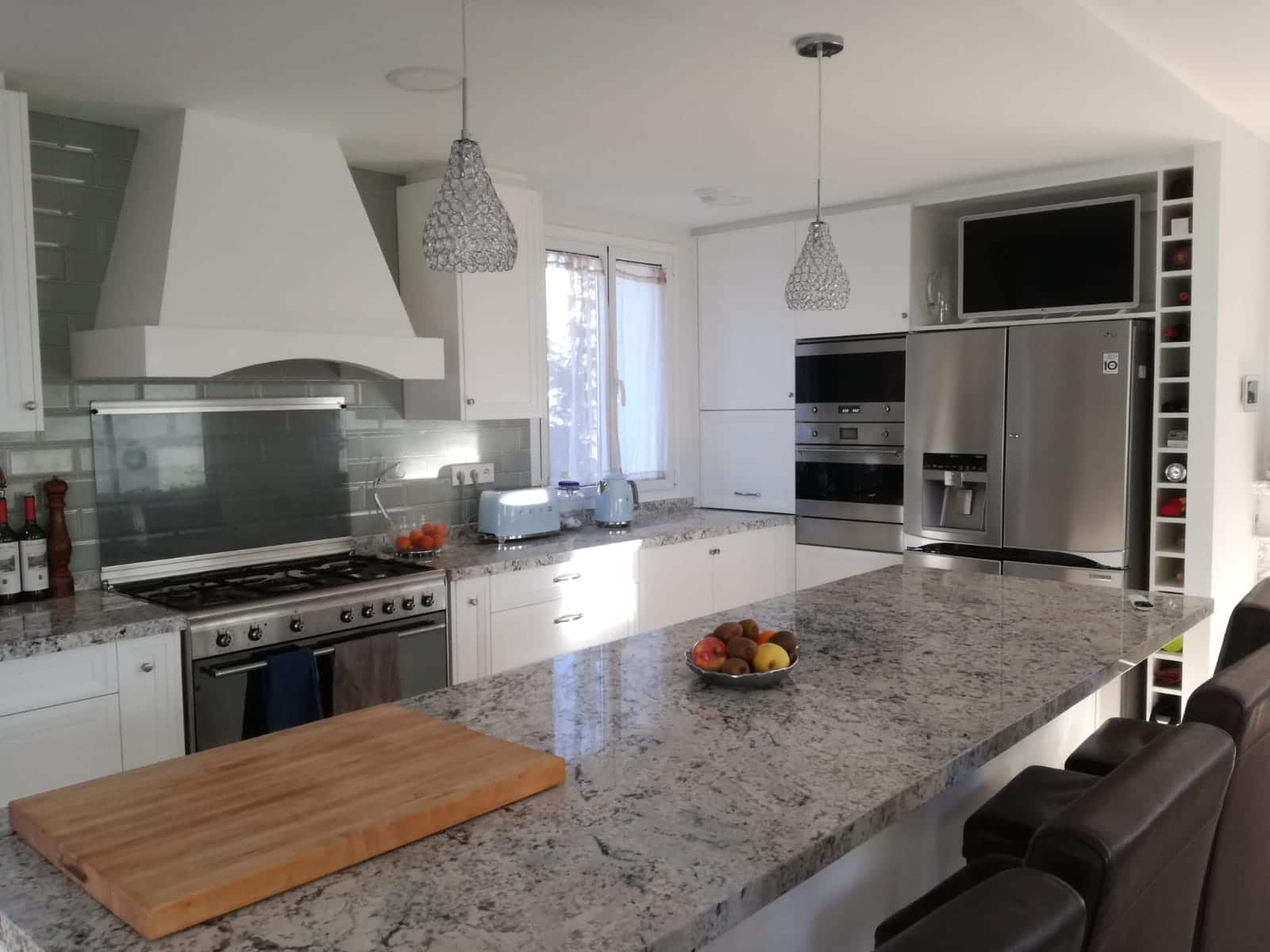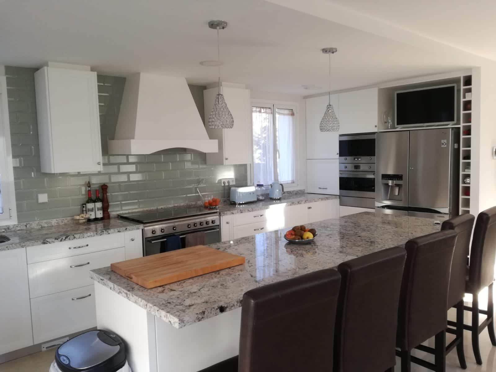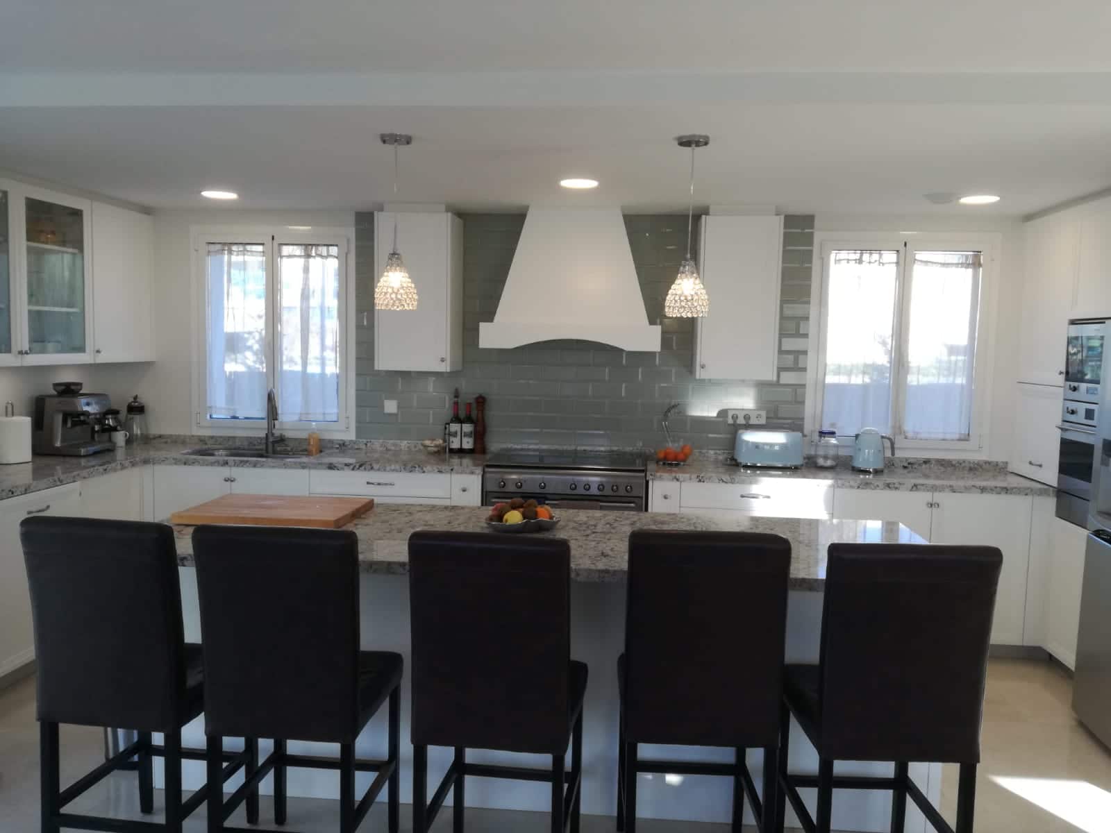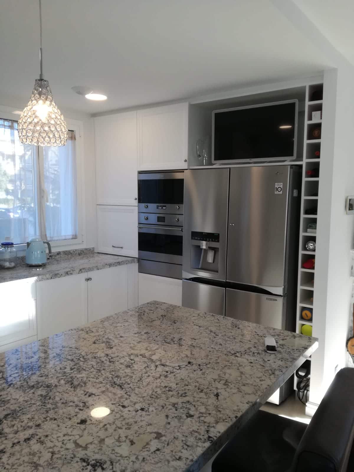 Els proprietaris originaris d’Estats Units que viuen a Castelldefels volien sentir com a casa. Van optar per un model més clàssic però amb punts de modernitat a el més pur estil americà. Una gran illa al centre de la cuina així com una campana en en centre de l’espai. Campana d’estructura de fusta pintada de el mateix color exacte que les portes de la cuina per integrar-se perfectament en l’espai. En el seu interior un motor d’alta potència per a l’aspiració dels fums de la cuina. </ P>