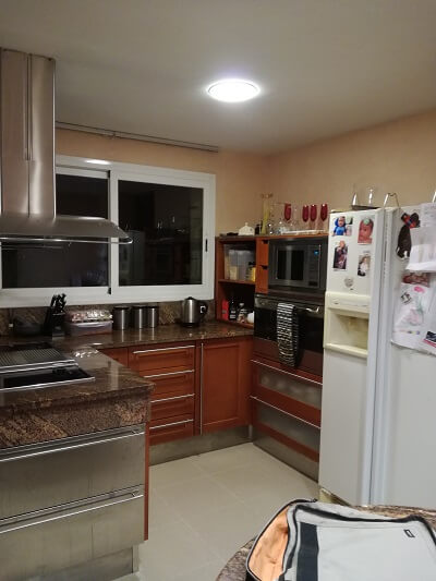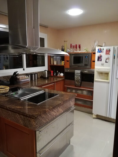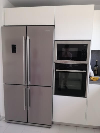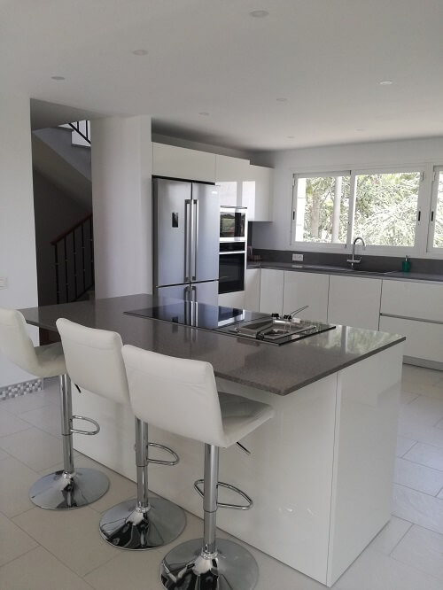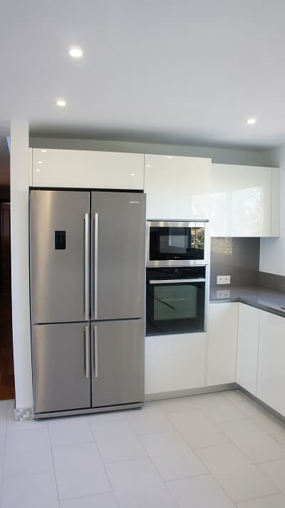 La nevera es americana y es de la marca Smeg. El mobiliario de cocina es de la marca INKO de color blanco brillo , sin tiradores. Muy funcional, no le falta detalle tanto en cajones y gaveteros extraíbles,  columnas de despensa, cajones interiores, especieros además de luces leds empotrados en muebles altos para conseguir puntos de luz de bajo consumo y de color cálido en el plan de trabajo.