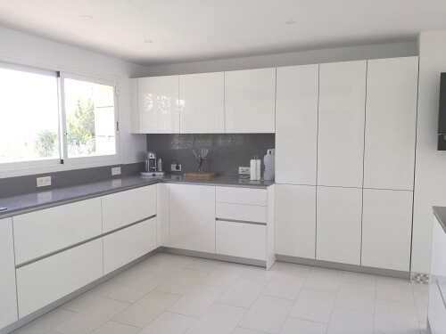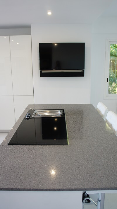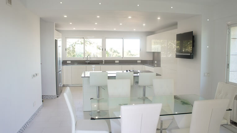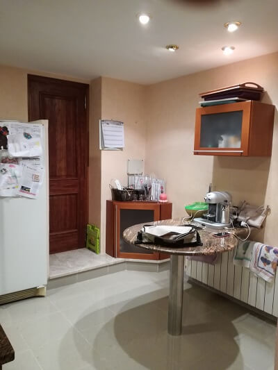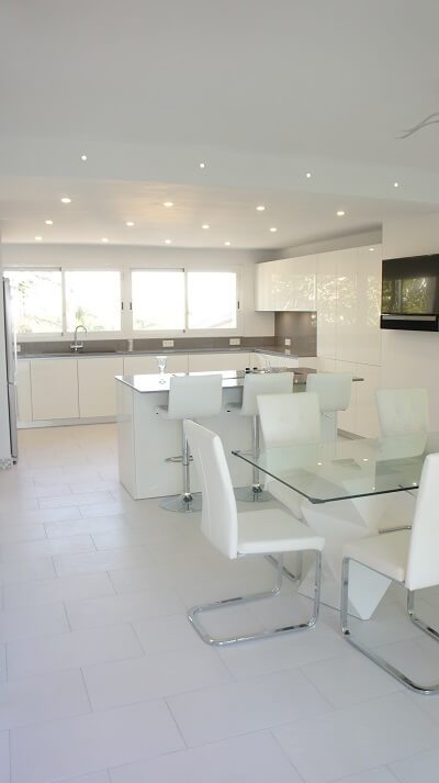 En casa de Rebecca la transformación es espectacular! El estilo de la cocina era de tonalidades más oscuras tanto en mobiliario como pintura de paredes, etc. Rebecca quería cambiar totalmente el look de la cocina a colores claros, abrir espacios derribando paredes que separaban la cocina del comedor. Se ha realizado una isla central con zona de cocción compuesta de placa de inducción y freídora. Todo de la marca DE DIETRICH. De esta manera la proprietaria puede cocinar de cara a familiares y amigos en un ambiente más abierto.