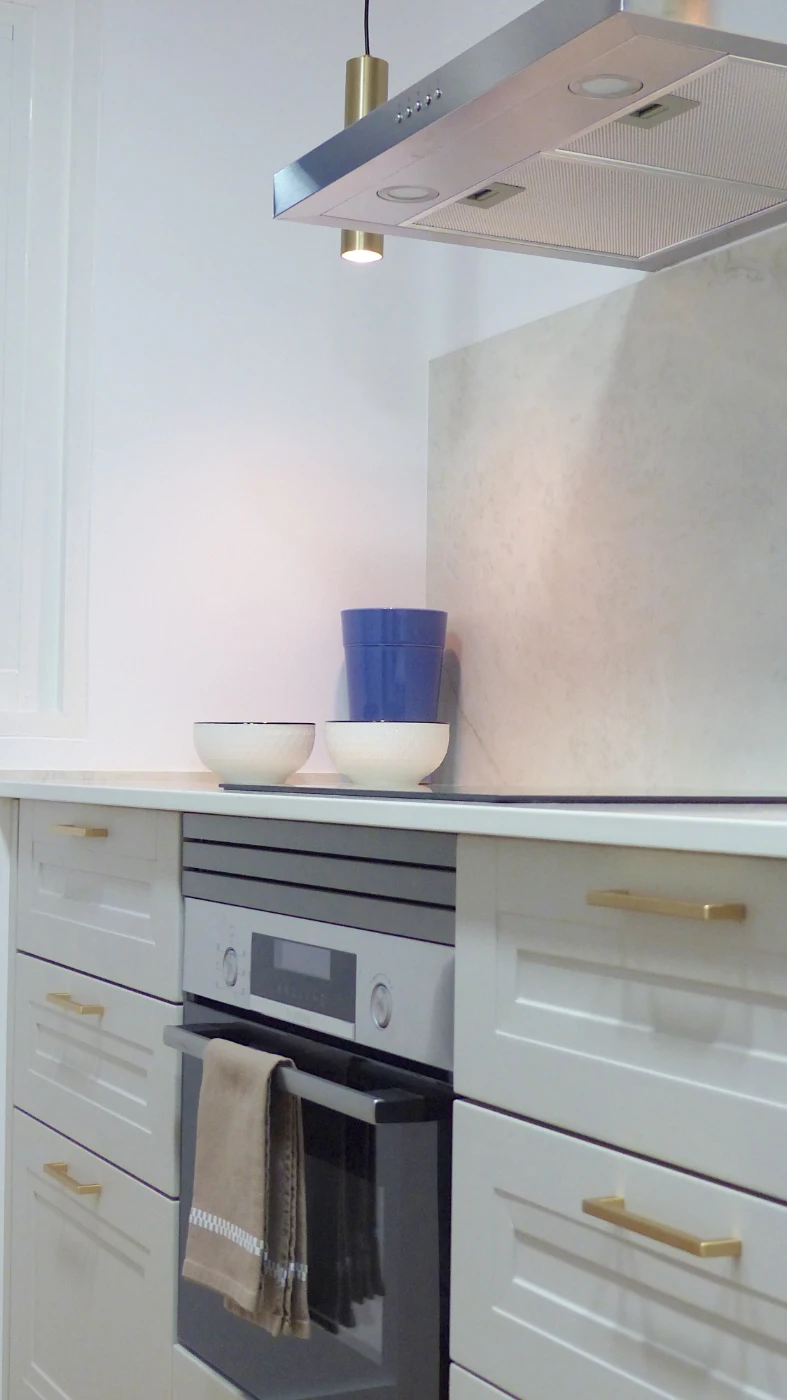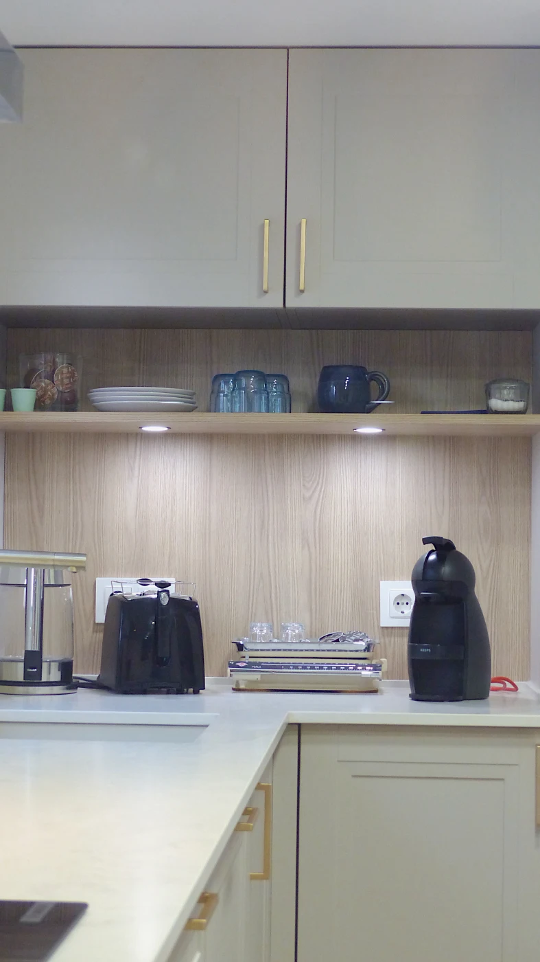 La encimera de Neolith Everest, con su tono cremoso y vetas suaves, aporta luminosidad y una textura natural que realza el conjunto. Los detalles dorados y una esquina de apoyo y desayuno completan el espacio, invitando a disfrutar del día a día con comodidad y estilo.