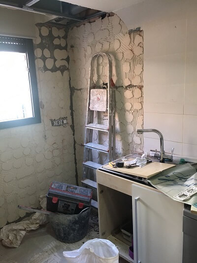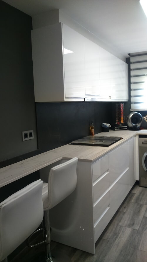El mobiliario de cocina es de la marca Inko modelo Amalia en color blanco brillante. La estética es sin tiradores ya que la propia puerta ya tiene la forma. La encimera es Dekton color Makai. Se ha derribado una pared del lavadero para unificar el espacio y agrandar la cocina. La lavadora se ha incorporado a la cocina y, para más comodidad, se ha instalado un mueble base con cesto extraíble para recoger la ropa sucia. También se ha creado una pequeña zona de café reduciendo la encimera de fondo para no entorpecer el paso. El espacio es cómodo, funcional a la vez que bonito. Una cocina bien aprovechada.