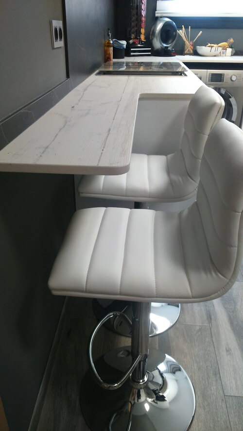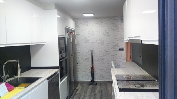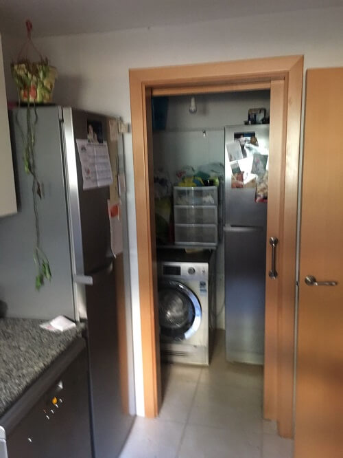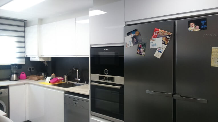 The kitchen furniture is of the Inko brand, Amalia model in glossy white. The aesthetics is without handles as the door itself is already shaped. The countertop is Dekton Makai color. A wall of the laundry room has been demolished to unify the space and enlarge the kitchen. The washing machine has been incorporated into the kitchen and, for convenience, a base cabinet with a pull-out basket has been installed to collect the laundry. A small coffee area has also been created by reducing the worktop in the background so as not to obstruct the passage. The space is comfortable, functional and beautiful at the same time. A well used kitchen.