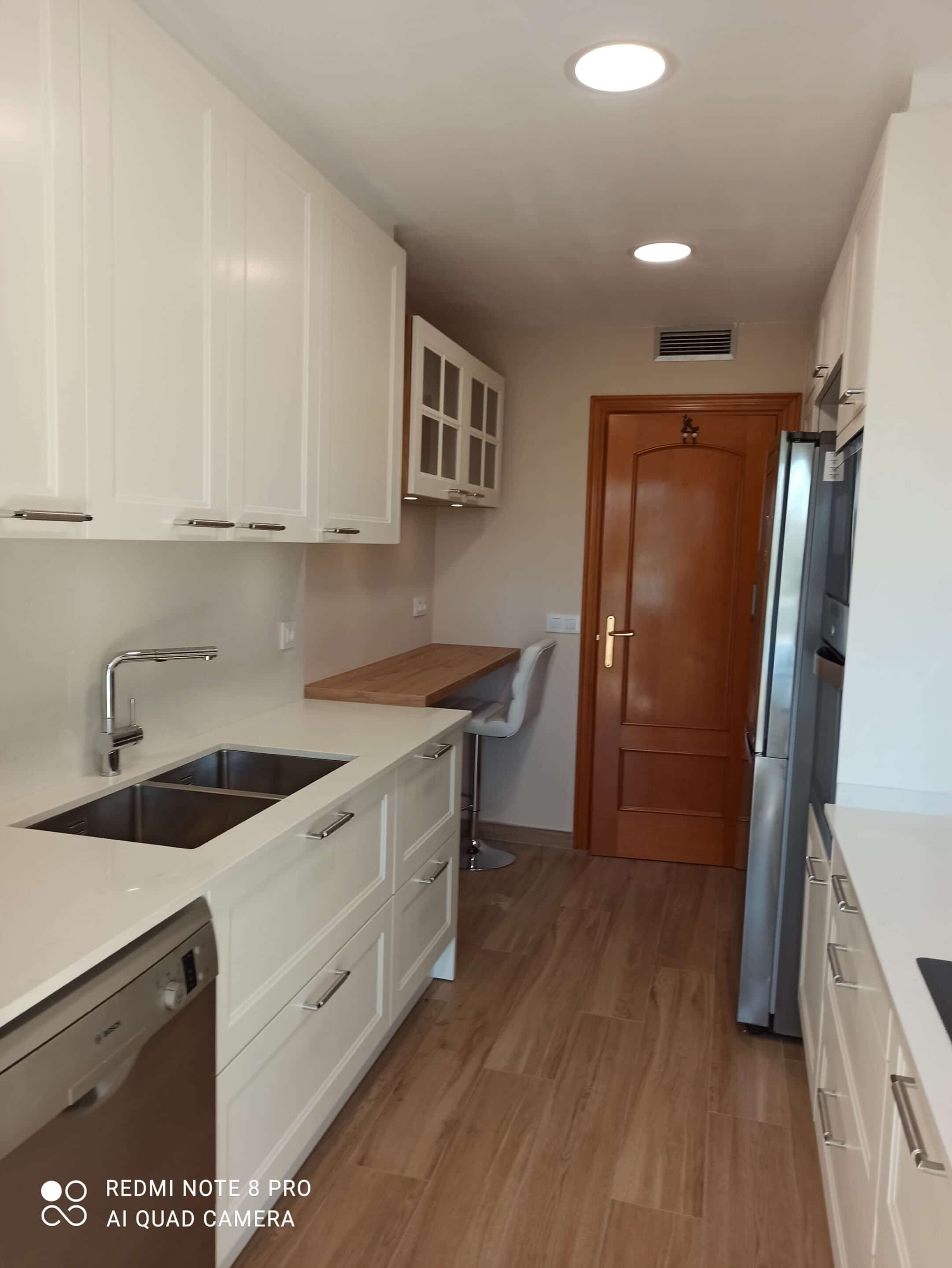 In this reform has been made change of pavement, removed the tiles from the wall and covered back with cladding on walls of the same material of the general kitchen countertop.