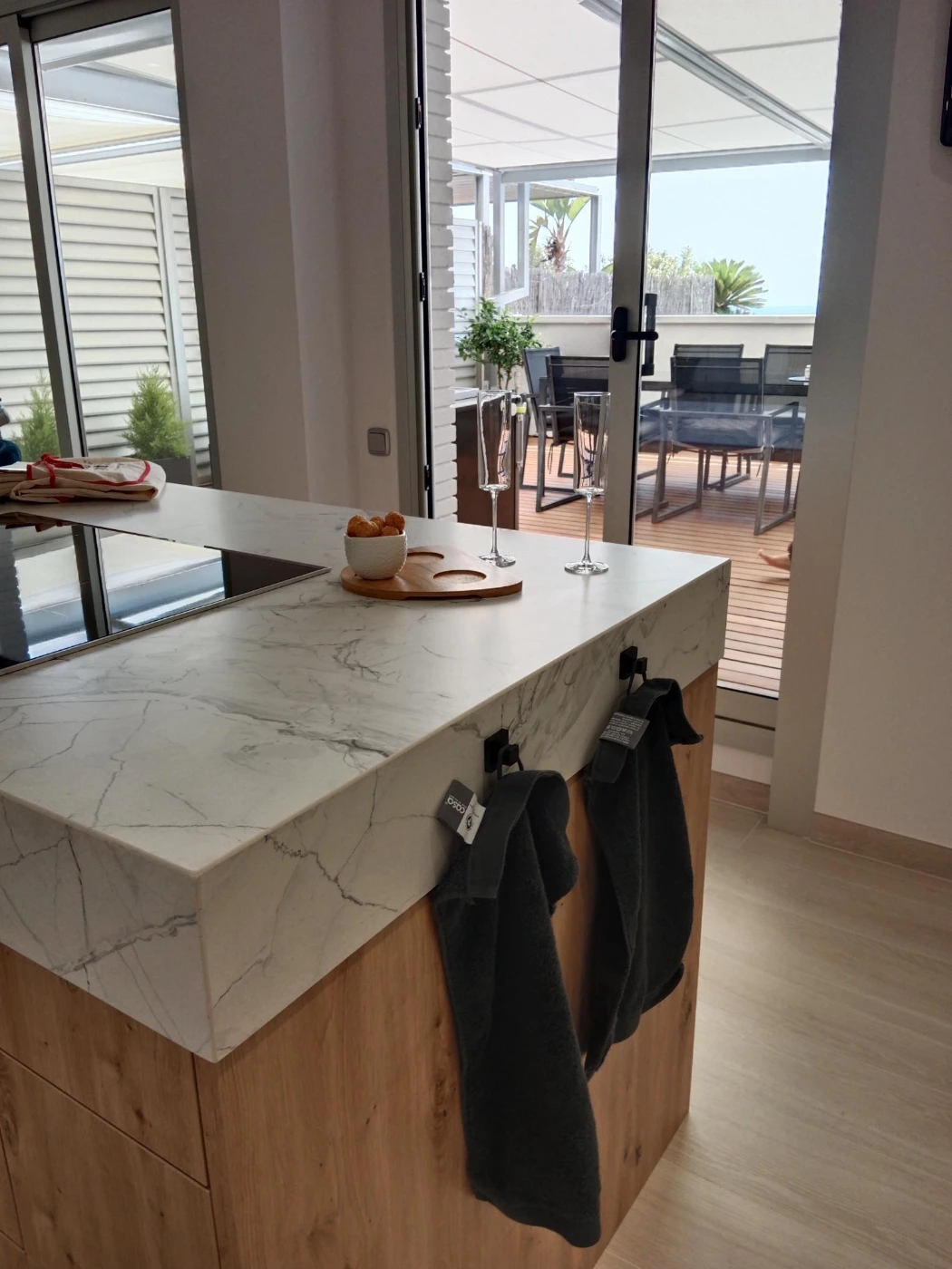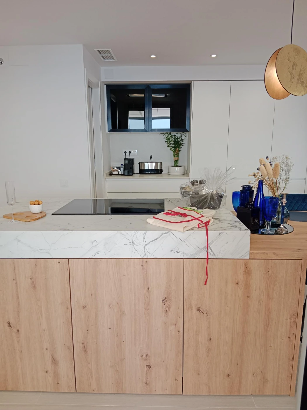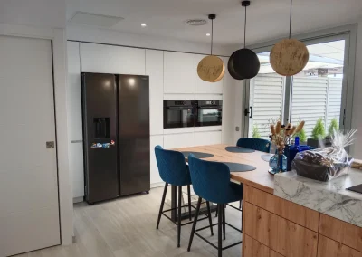 In the countertop, 2 materials have been combined: IDYLIUM VIA LATTEA in the sink and coffee area, IDYLIUM CARAVAGGIO ALBUS in the central island area with a 15cm skirt to give more height to the island and make it more comfortable for the owners.