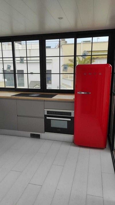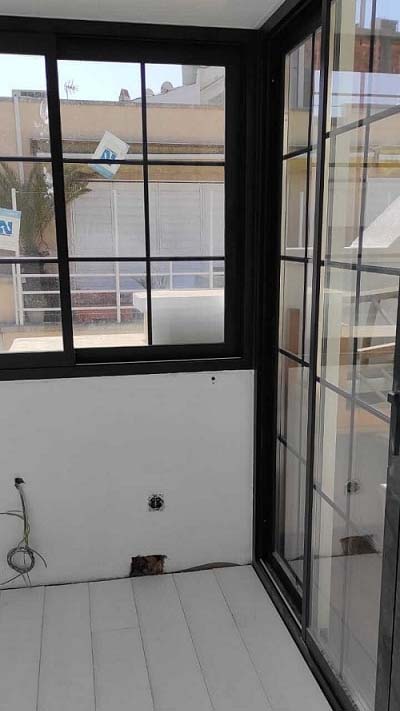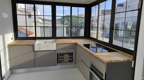 This project consisted of transforming an outdoor terrace of an apartment in Sitges into a kitchen-veranda with black aluminum carpentry enclosure that allows to enjoy this space both in summer and winter.