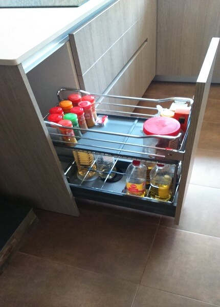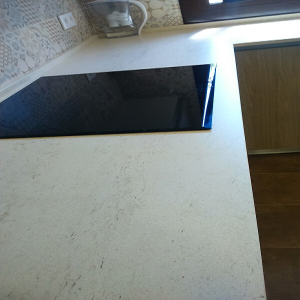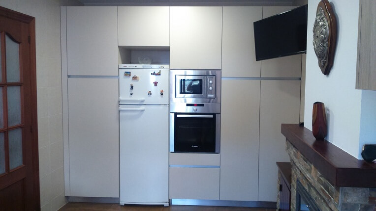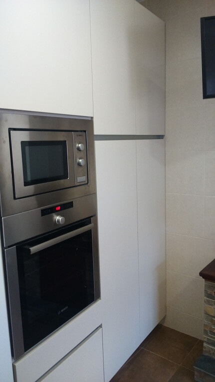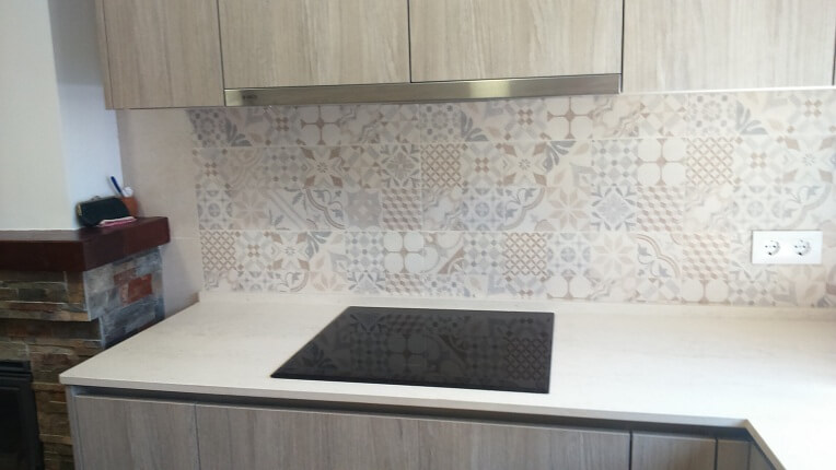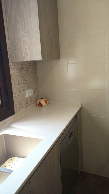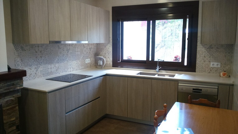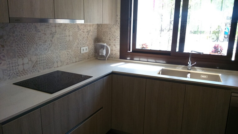 The renovated kitchen in the Montserrat house combines 2 colors. A light wood color from Inko’s habitat series and the cream color from Inko’s Gourmet series. The combination is very fine. The countertop is a Dekton, super heat resistant material. The sink is of the brand Dake in Silgranit and is under countertop. The tile of the walls is hydraulic style and gives the kitchen a modern style but at the same time a vintage touch.