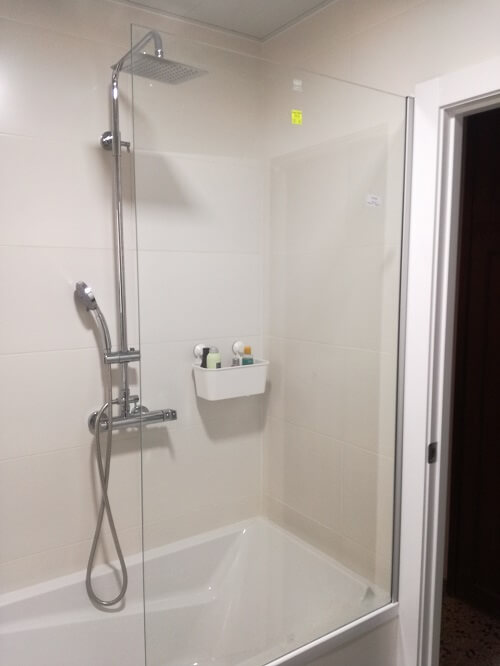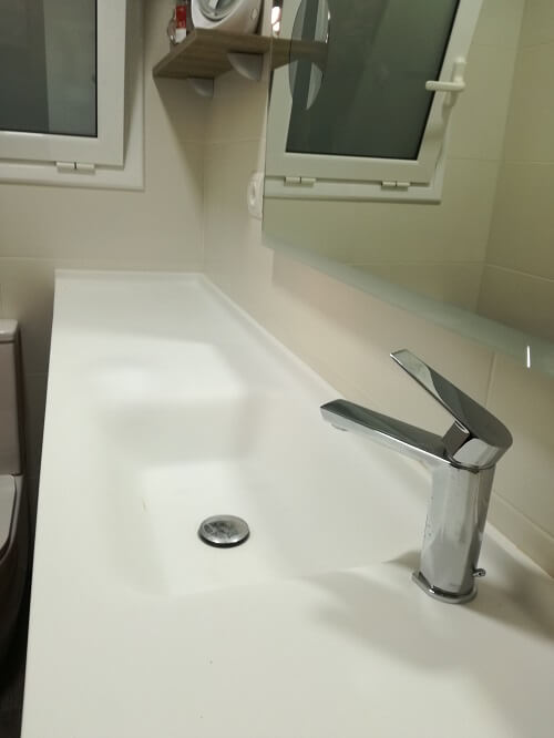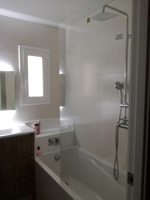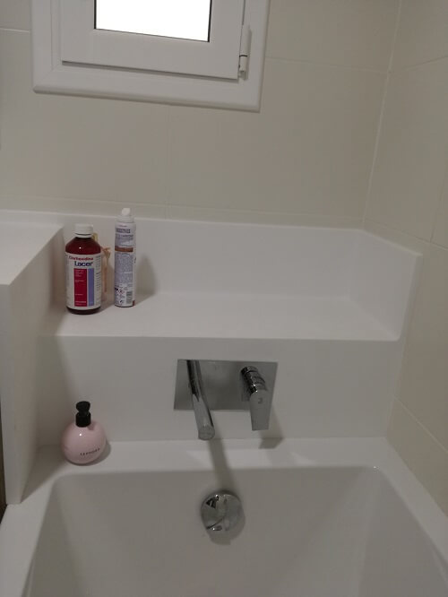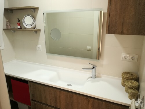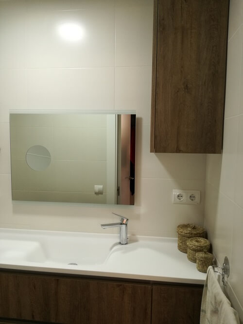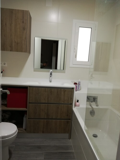 The bathtub was replaced by one with a shelf to provide more space to place bathroom accessories. In addition, a main cabinet was added along with the sink, and other auxiliary units throughout the bathroom so as not to lose storage space while giving a homogeneous touch to the space. All of them in wood tone. The countertop and all the shelves for the sink and accessories are made of white synthetic material from the KRION brand.