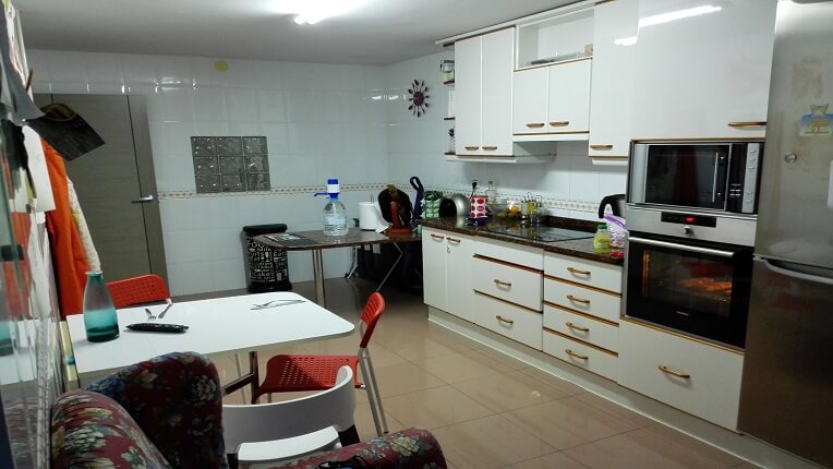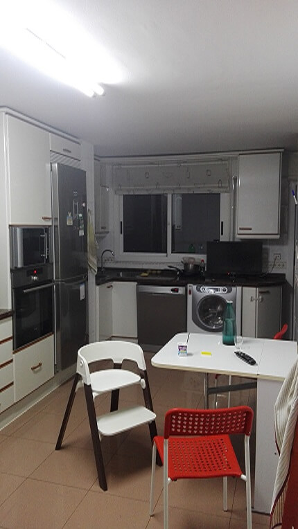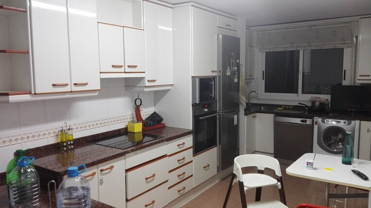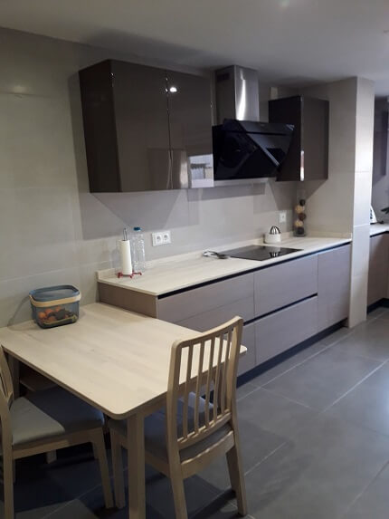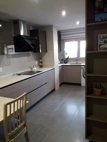 This kitchen has been completely renovated. The floor has been changed with large pavement to give a feeling of spaciousness to the space. It has also changed the tiles on the walls. The kitchen is of the Italian brand Stosa. The wall units are in gloss lacquer and the base units in matt lacquer. Alevé model with doors opening without handles gola system. The ceiling is made of aluminum with low consumption led lights of white light.
