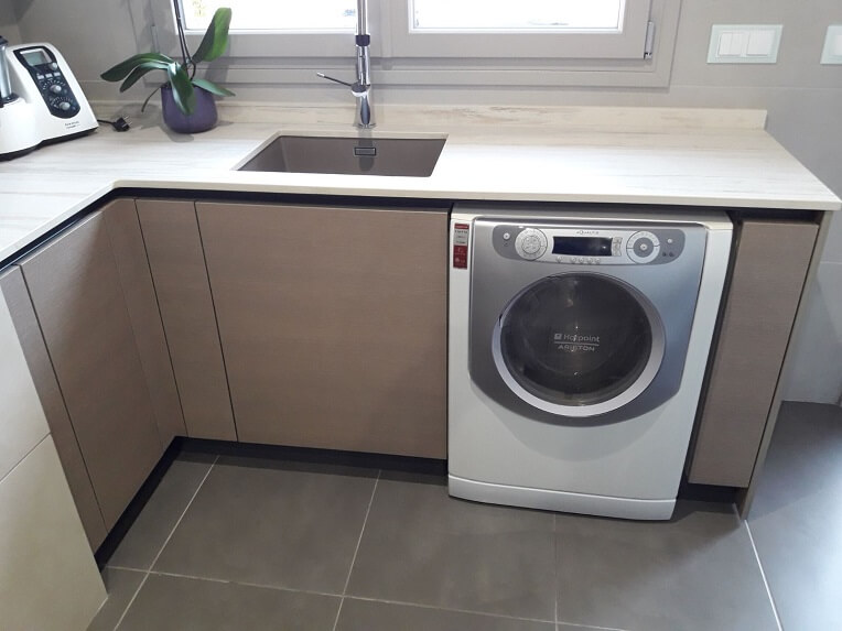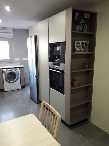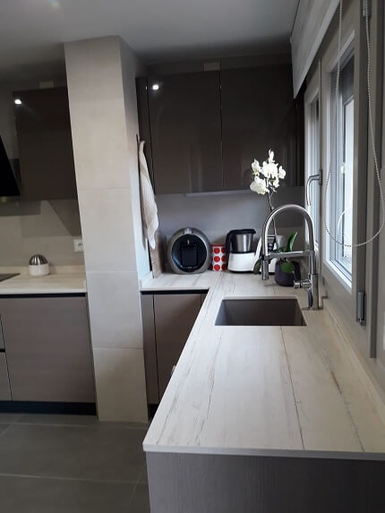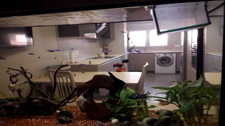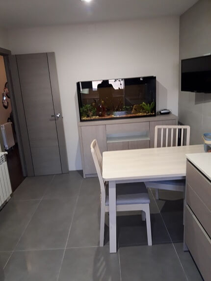 The countertop is Dekton makai color. It has taken advantage of a dish rack on the wall that separates the kitchen from the dining room to place a fish tank. It gives the kitchen a very original and colorful touch. Below has been placed a small office space.