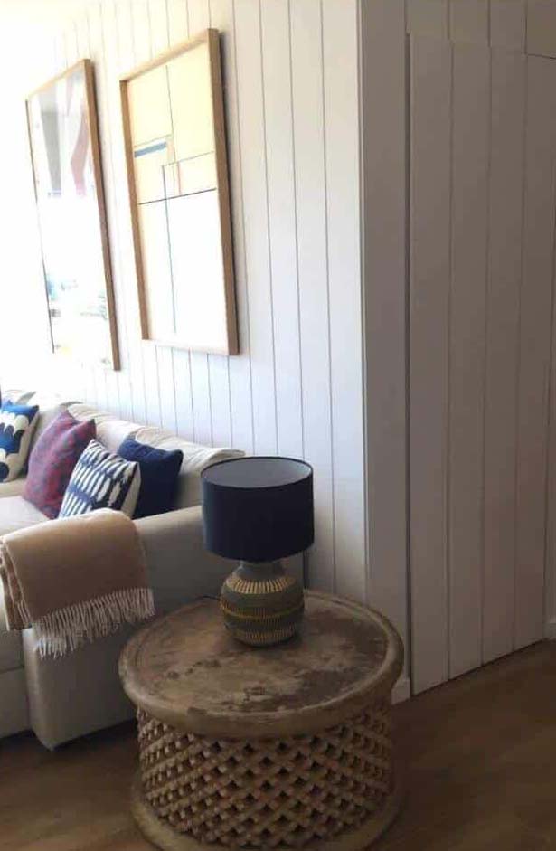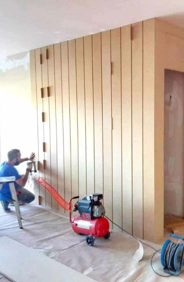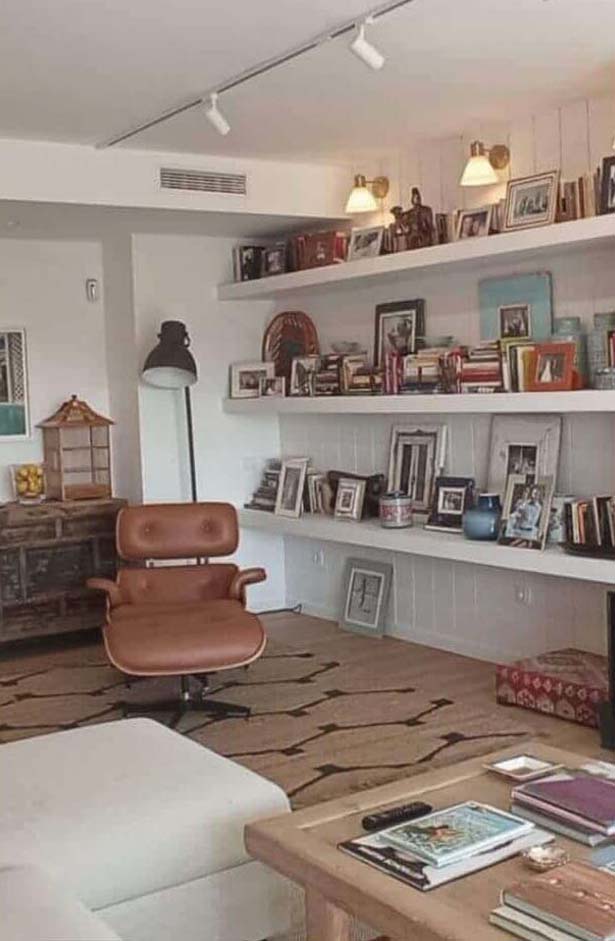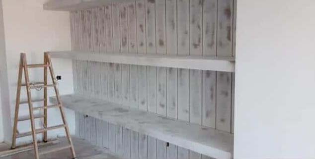 En el salón se ha construido una librería con material de DM LACADO DE COLOR BLANCO MATE para crear un espacio acogedor y funcional.