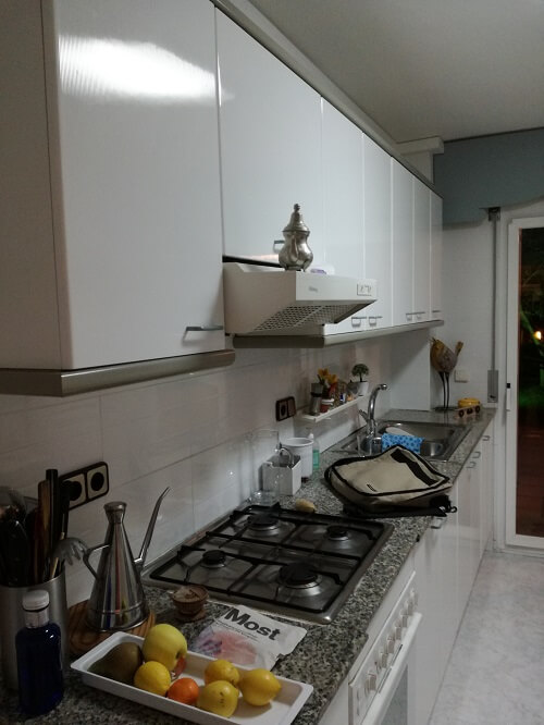 Se ha procedido a cambiar todos los azulejos del suelo y paredes. Se ha cambiado los aluminios de color blanco. Se han empotrado luces leds cuadradas con cerquillo blanco para mimetizarse con el techo que dan una luz a la cocina que se agradece enormemente a la hora de trabajar.