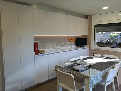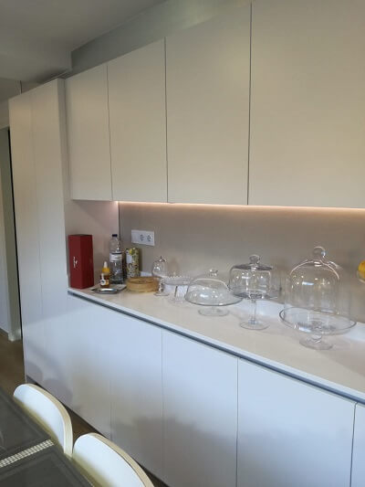La zona del office tiene leds debajo de los muebles regulables en intensidad. Los muebles en esta zona son de profundidad reducida para crear más espacio para la mesa y aligerar el espacio.