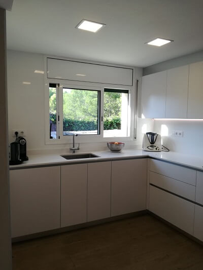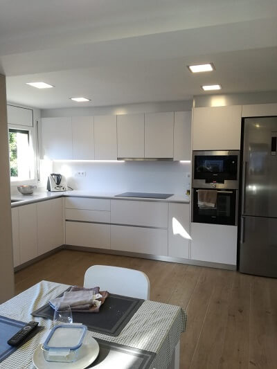 En la reforma integral de esta cocina en Vilanova i la Geltrú, el lampista fue el encargado de dar luz con tecnología led a petición del cliente que solicitó una zona office para desayunos, cafetera y pequeños electrodomésticos.