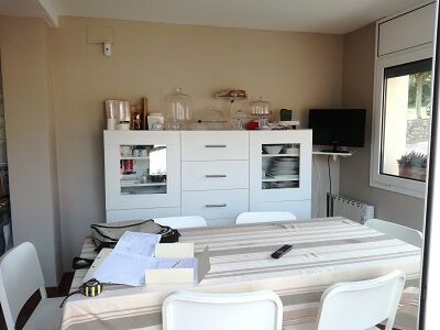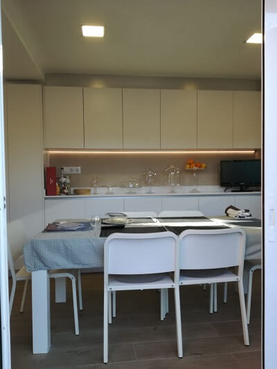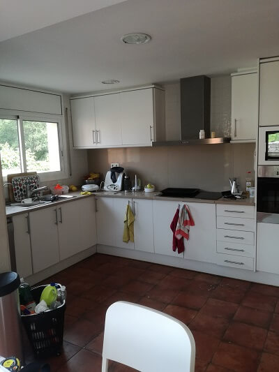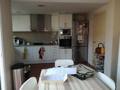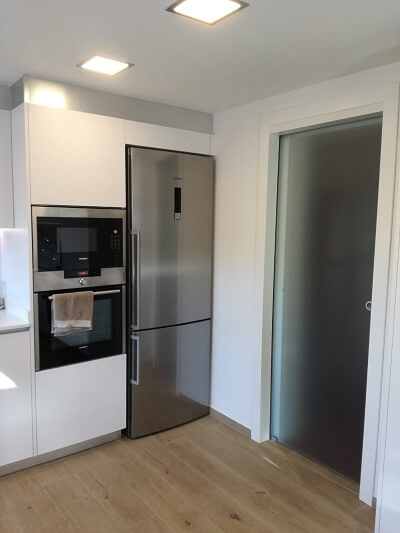 La puerta de entrada de la cocina se sustituyó por una puerta corredera de cristal transparente tal como quería la propietaria para dar sensación de mas amplitud a la cocina y para no restar espacio y facilitar la apertura de la nevera que justo se ubica en la entrada de la cocina.
