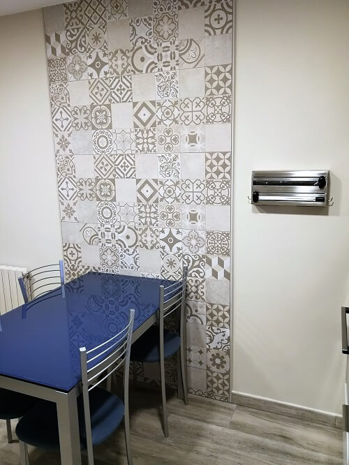 La proprietaria ha optado por añadir una franja de azulejos hidráulicos en una de las paredes para romper un poco con el estilo general de paredes pintadas.