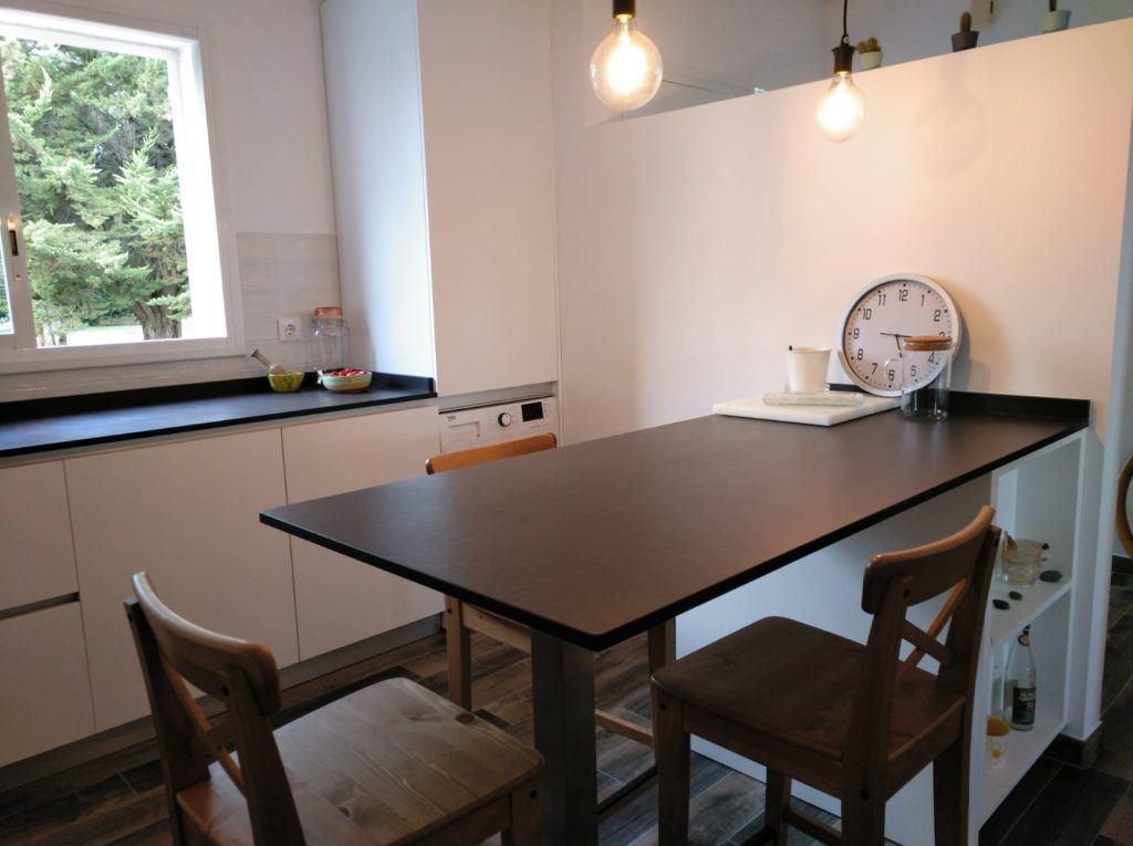 En esta reforma completa del espacio de cocina en Sant Pere de Ribes, se ha rebajado de altura la pared de la entrada a la casa para aligerar la estancia. Se ha cambiado los azulejos del suelo no sólo en cocina sino también en el salón-comedor para unificar y homogeneizar espacios.